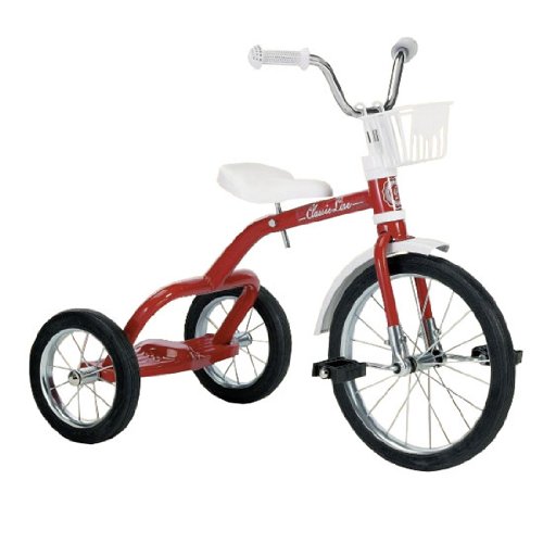 "Italtrike Classic 16 Spoked (RED) The Classic 16-inch Tricycle is the standard of all tricycles, finished in a traditional red color with free front mounted basket. Features: Steel tube construction for durability Front basket for storage Deep red color for classic appeal Padded seat for comfort Adjustable seat Foot platform for second rider Chrome spoke wheels Some assembly required Dimensions: 29"" H x 34 1/4"" L x 20 1/2"" W (approx) Weight: 18 lbs (approx)" |